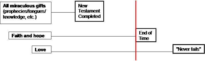 Cor. 13:8 says that prophecies, tongues and knowledge would cease, but verse 13 says that faith, hope and love abide. (The Greek word for "abide" [meno] carries the idea of something lasting in time and is also translated "continue, remain, endure, tarry, etc.") In other words, faith, hope and love would outlast prophecies, tongues and (gifted) knowledge. Now, let's start with the thing that lasts the longest, love. While faith, hope and love "abide," love never fails. (verse 8) Does this mean that faith and hope will fail someday? Actually, yes. "Faith is the substance of things hoped for, the evidence of things not seen." (Hebrews 11:1) And "hope that is seen is not hope; for why does one still hope for what he sees?" (Romans 8:24) When Jesus returns, both our faith and our hope will be replaced by what we "see," and so will be done away. So there are actually two stopping points that we need to consider in order to understand 1 Corinthians 13.